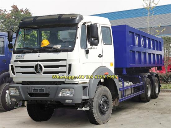20-ton hooklift system, 20CBM garbage containerМусоровоз Beiben 20-тонный с роликовым механизмом — это эффективное и прочное мусоровозное оборудование, подходящее для сбора отходов в различных условиях, таких как коммерческие районы и поселки. Он построен на шасси Beiben 2638 с колесной формулой 6×4 и оснащен дизельным двигателем Weichai WP10.380E32 мощностью 380 л.с. в сочетании с быстрой 12-ступенчатой коробкой передач, что обеспечивает высокую производительность и отличную грузоподъемность. Его основная система крюкового захвата обеспечивает максимальную грузоподъемность 20 тонн и работает в паре с мусорным контейнером из углеродистой стали объемом 20 кубических метров. Гидравлический механизм обеспечивает ход выдвижения около 1200 мм, что позволяет поднимать контейнер примерно за 55 секунд, и угол саморазгрузки до 50 градусов, обеспечивая гибкость и удобство эксплуатации. Поддерживает режим циркуляции с одним контейнером и несколькими контейнерами. Мусоровоз Beiben с крюковым погрузчиком Также оснащён гидравлическими замковыми устройствами и усиленными задними опорами, обеспечивающими устойчивость и безопасность при транспортировке и разгрузке. Это значительно повышает эффективность работ по сбору и перемещению отходов.